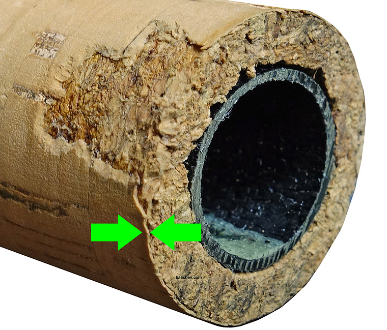 Многие из нас, надо полагать, знают, что в нынешний век пробкового дефицита и фантастической дороговизны хорошей пробки та красивая пробка, которая видна на рукоятке удилища, может быть лишь пробковым шпоном, под которым находится всякое дерьмо. Но меньше число тех рыболовов, которые понимают, насколько тонок этот слой, и знают, что такой «мелкий обман» («производители», как правило, даже не заикаются о шпоне) встречается даже у дорогих и «раскрученных» моделей. На фото разреза это, конечно, видно неплохо, но для лучшего понимания пропорций хорошо разок распилить рукоятку самому или повертеть в руках кусок распиленной. Кто собирает и ремонтирует удилища — дело другое, а вот «обычный» рыболов…